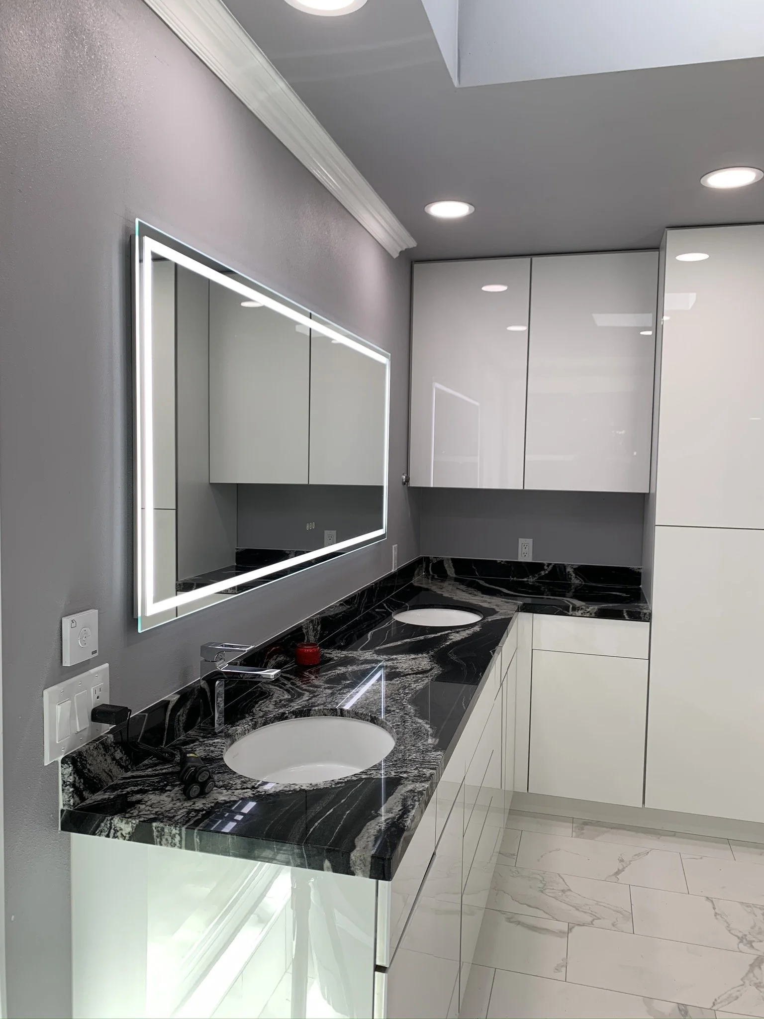 Small space but efficient bathroom. We incorporated modern building products such as wall-hung toilets, curbless showers. Plenty of storage for all the daily needs, through efficient and attractive use of cabinets. The previous layout was very uncomfortable with toilets and sinks placed at awkward places.